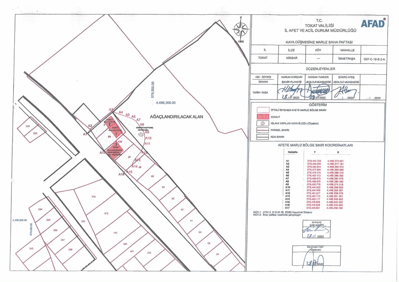 TOKAT İLİ NİKSAR İLÇESİ İSMETPAŞA MAHALLESİNDE BULUNAN VE 28/11/2022 TARİHLİ JEOLOJİK ETÜT RAPORUNDA SINIRLARI BELİRTİLEN BAZI YERLEŞİM YERLERİNİN AFETE MARUZ BÖLGE OLARAK İLANI HAKKINDAKİ 04/07/2016 TARİHLİ VE 2016/9052 SAYILI BAKANLAR KURULU KAPSAMINDAN ÇIKARILMASINA KARAR VERİLMİŞ OLUP, 06.09.2023 TARİH VE 7588 SAYILI CUMHURBAŞKANI KARARNAMESİ İLE AFATE MARUZ BÖLGE DIŞINDA BIRAKILAN ALANLARA AİT KROKİ 7269 Sayılı UMUMİ HAYATA MÜESSİR AFETLER DOLAYISİYLE ALINACAK TEDBİRLERLE YAPILACAK YARDIMLARA DAİR KANUN 14. maddesi gereğince, 13.10.2023 – 11.11.2023 tarihleri arasında belediye giriş katına asılmıştır.