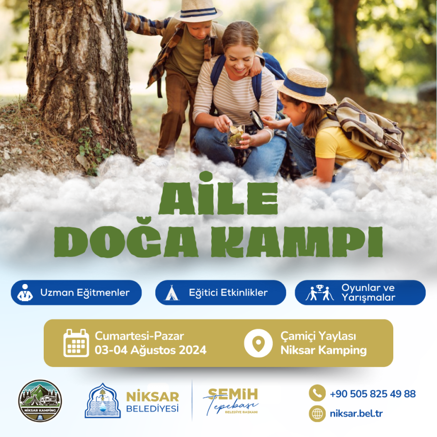 Çamiçi Yaylası Niksar Kamping tesislerimizde Anne Baba Çocuk Doğada Yaşam Becerileri Kampı etkinliği planlanmıştır. Belediye Başkanımız Semih Tepebaşı'nın seçim vaatleri arasında bulunan Aile Doğa Kampının birincisini 3-4 Ağustos 2024 tarihleri arasında Uzman Eğitmen eşliğinde doğal hayata ve çevreye duyarlı, saygılı ve yardım sever nesiller yetiştirmek için doğada yaşamayı öğreten eğitim kampımızı Çamiçi Yayla’mızda düzenleyeceğiz. Dolu dolu geçecek kamp etkinliğimizde eğitici etkinlikler, oyunlar ve yarışmalar olacak. Katılmak isteyen ailelerimiz aşağıdaki formu eksiksiz olarak doldurarak başvurması gerekmektedir.